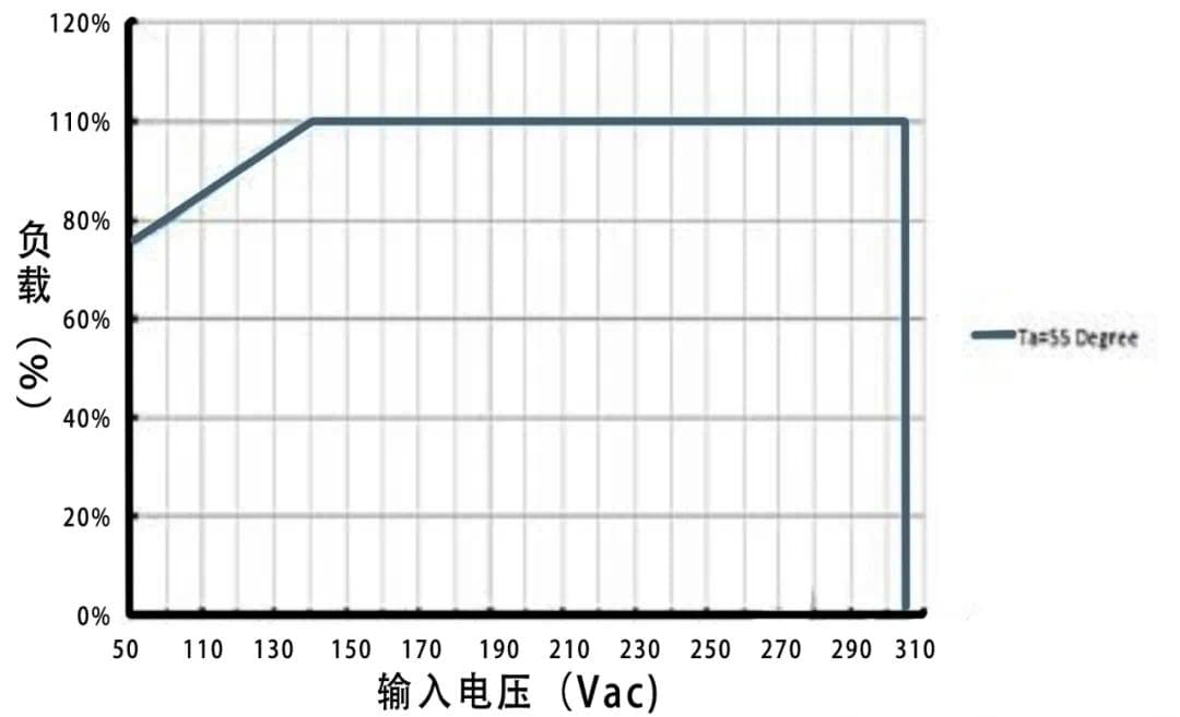 As shown in Figure 2, the blue curve represents the derating curve of the output power of the LED driver power supply as the input voltage changes when the ambient temperature is 55°C. When the input voltage is 140Vac, the load of the driving power supply is allowed to be 100% full load, and the input voltage is lowered; if the output power remains unchanged, the input current will increase, resulting in increased input loss, reduced efficiency, and increased device temperature. It may exceed the standard, and may even lead to device failure.
