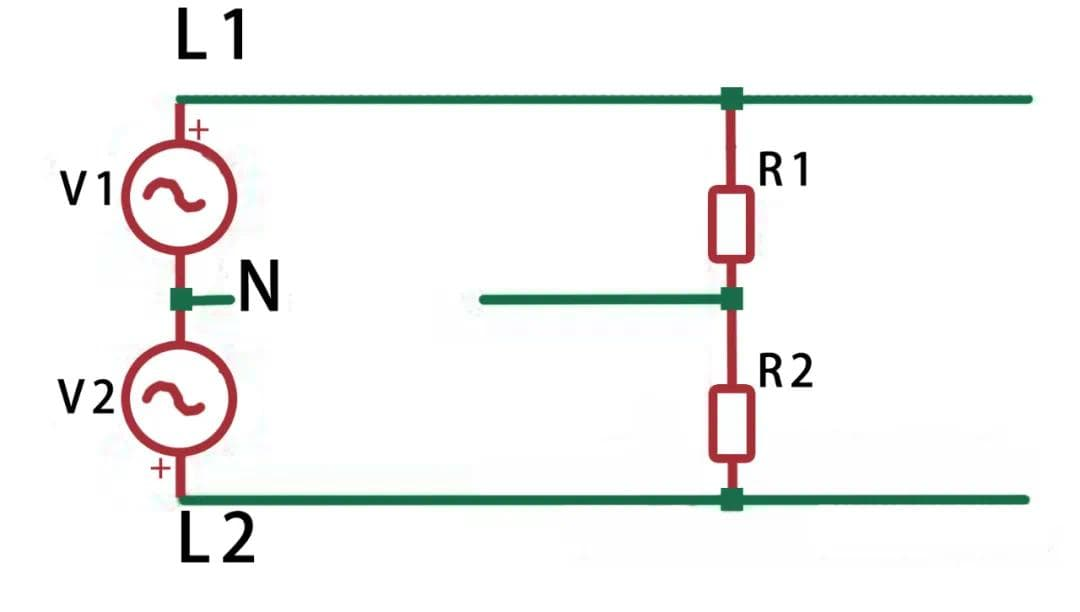 As shown in Figure 3, V1 represents the first phase voltage, V2 represents the second phase voltage, R1 and R2 respectively represent the LED driver power normally installed in the line. When the neutral line (N) on the line is disconnected as shown in the figure, the led power R1 and R2 on the two branches are equivalent to being connected to 380Vac voltage after being connected in series. Due to the difference in input internal resistance, when one of the driving power sources is charged to start, the internal resistance becomes smaller, and most of the voltage may be applied to the other driving power source, causing its overvoltage damage and failure. Therefore, it is recommended that on the same power distribution branch, the switch or circuit breaker should be disconnected together, and the neutral line should not be disconnected only. Do not place the power distribution fuse on the neutral line, and avoid poor contact of the neutral line on the line.