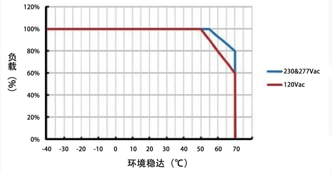 The blue curve represents the power derating curve of the load changing with the ambient temperature when the LED power supply is input at 230Vac or 277Vac. The principle is similar.
